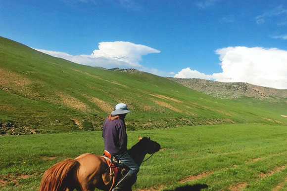 大草原のテント設営の場所へ向けて遊牧民と馬とともに乗馬ライディング・ライフへ出発。