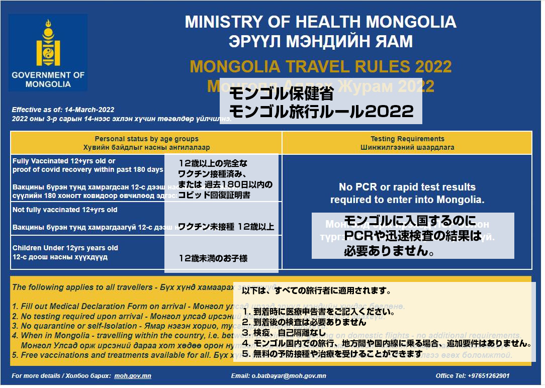 モンゴル保健省 モンゴル旅行ルール2022